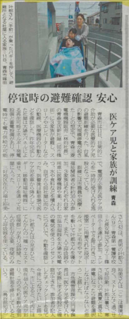医療的ケア児避難訓練が、青森支店・特機支店で実施されました 2025年10月21日 最終更新日時 : 2025年10月21日 admin 医療的ケア児避難訓練の様子が10月12日の東奥日報に掲載されました。